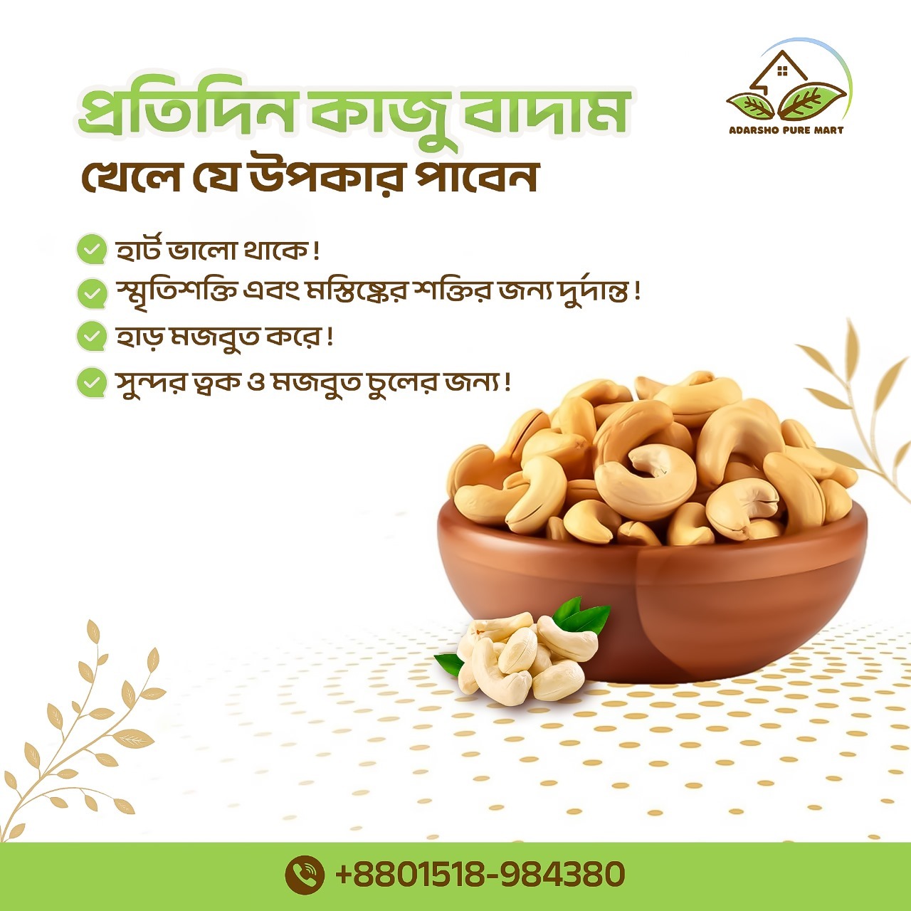 ✨ স্ন্যাক, ডেজার্ট বা রান্নার উপকরণ হিসেবে ব্যবহারযোগ্য – স্বাস্থ্যসম্মত ও প্রিমিয়াম মানের কাজুবাদাম, শুধু Adarsho Pure Mart-এ।
